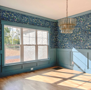 The whole inspiration for the home came from a piece of gorgeous blue wallpaper that she had fallen in love with because it reminded her of the fabric on a sofa from her childhood. She wanted it in the dining room so that it would be easily visible from various parts of the first floor. It's a statement, so let it be seen! From there, we pulled a softer shade of blue to use in the kitchen and on a select few doors to carry the color throughout the first floorm (I'll note all the paint colors at the bottom of this post). Everything else from there really just fell into place.