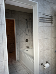 And lastly, the combo tub/shower wet area... where do I start? The tile in the shower accent was executed perfectly. And did you notice the details with the linear drain and glass panel? Both were installed seamlessly so that they disappear into the tile. Clean installs like this can really make or break a design.